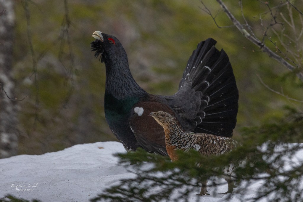 Tiur bak, med røy framfor seg. Som du ser er det stor foskjell på størrelsen og fjørdrakta..